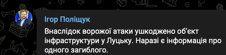 9.08 В Луцке прилет по объекту инфраструктуры. Есть погибший, сообщает мэр города.