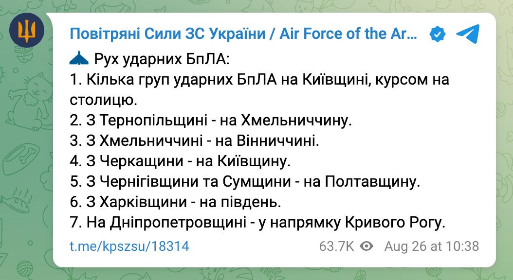 В небе несколько десятков "Шахедов". Также Воздушные силы заявили о ракетной атаке с юга, со стороны Херсонской области, и на севере со стороны Сумской.