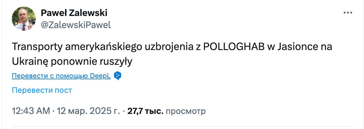 "Снова начали транспортировку американского оружия через POLLOG HUB (логистический хаб) в Ясенке в Украину", - сообщил замминистра нацобороны Павел Залевский.