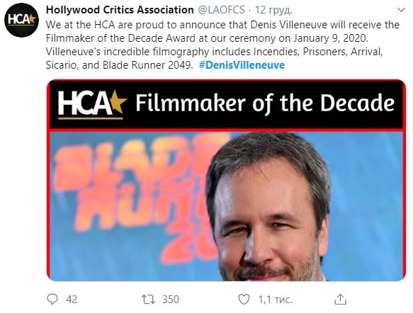 12 декабря в Голливудской ассоциации кинокритиков канадца Дени Вильнева назвали лучшим кинорежиссером. Об этом сообщается на аккаунте ассоциации в Twitter. В посте сказано, что соответствующую награду он получит на церемонии 9 января 2020 года.