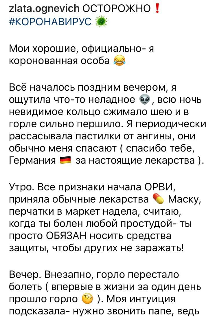 По словам Златы, высокая температура, а именно 38,2 у нее держалась только один день, поэтому ей пришлось пить антибиотик, после чего у артистки начался инфекционный кашель. Вместе с тем Огневич добавила, что антибиотик бессилен перед вирусами. Поэтому просто так его пить не стоит.