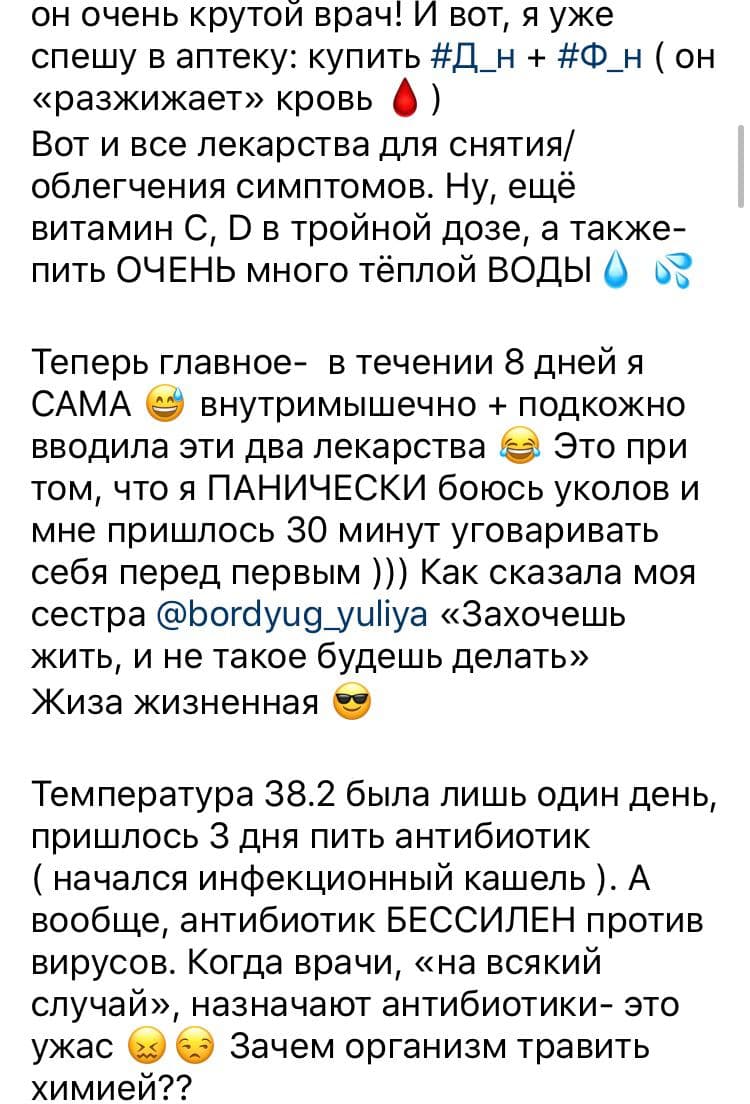 "И вот я уже спешу в аптеку: купить "Дексаметазон" и "Фраксипарин" (он "разжижает" кровь). Вот и все лекарства для снятия/облегчения симптомов. Ну, еще Витамин C, D в тройной дозе, а также - пить очень много теплой воды", - поделилась певица.