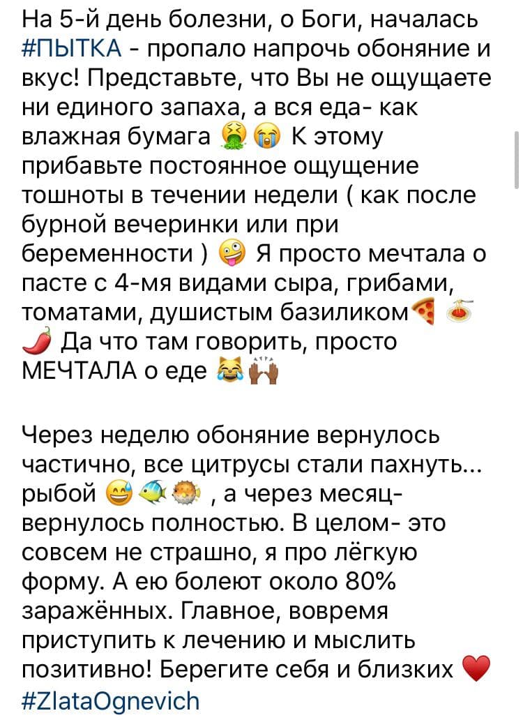 "На 5-й день болезни, о Боги, началась пытка - пропало напрочь обоняние и вкус! Представьте, что Вы не ощущаете ни единого запаха, а вся еда- как влажная бумага. К этому прибавьте постоянное ощущение тошноты в течении недели ( как после бурной вечеринки или при беременности). Я просто мечтала о пасте с 4-мя видами сыра, грибами, томатами, душистым базиликом. Да что там говорить, просто мечтала о еде",- добавила Злата.