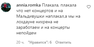 "Плакала, плакала, что нет концертов и на Мальдивушки наплакала. А мы на "лохдауне" ничего не заработаем и на концерты не пойдем", - отметила еще одна девушка.
