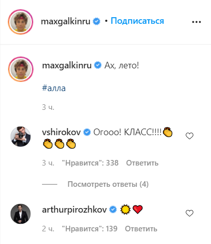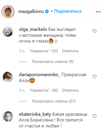 В комментариях пользователи оставили много восхищенных комментариев: "Огооо! Класс", "Как выглядит счастливая женщина, прям огонь в глазах", "Прекрасная Алла", "Какая красавица Алла Борисовна! Вся светится от счастья и любви", "Свежая летняя красотка", "Алла, какая Вы счастливая", "Чудесное фото! Сколько в нём радости и позитива", - пишут пользователи под фото.