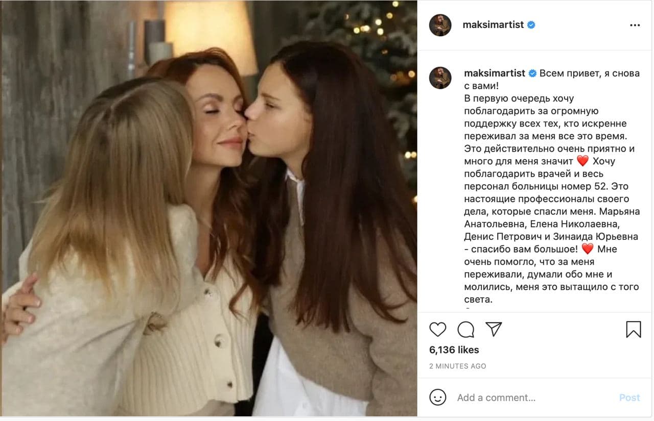 Максим переводят в обычную палату. Скриншот инстаграма