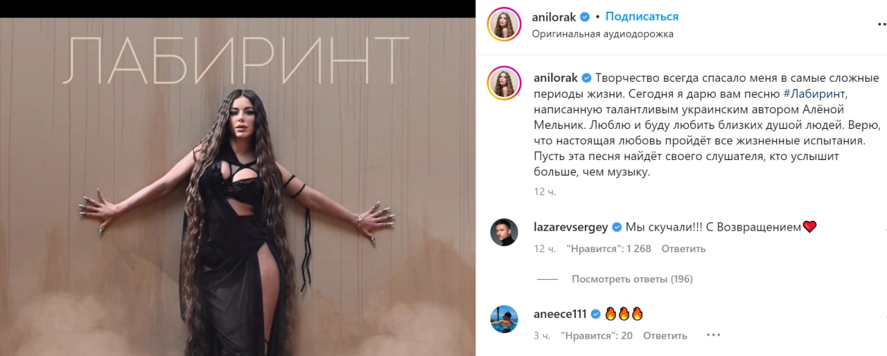 В сентябре Ани Лорак, которая с начала вторжения РФ закрыла свои соцсети и никак не комментировала войну, вернулась в Instagram. "Я закрываю глаза и мысленно обнимаю каждого, кто читает эти строки. Моё сердце переполнено любовью, болью, состраданием, страхом, тревогой. Сцена - моя жизнь. Я могу жить, когда дышу одним воздухом с вами. Я пою, пока мои песни касаются вашей души". - написала она под своим фото.