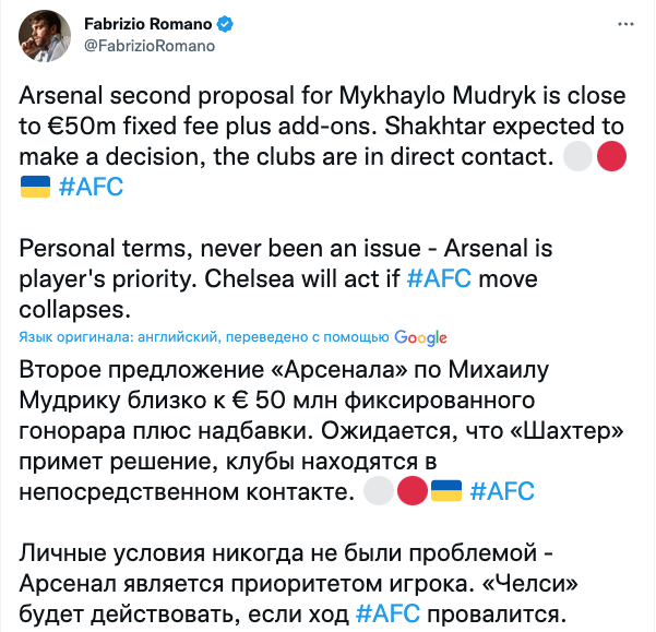 Авторитетный футбольный инсайдер Фабрицио Романо сообщает, что лондонский "Арсенал" сделал уже два предложения по трансферу украинского полузащитника Михаила Мудрика.