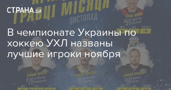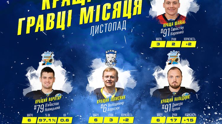 В ноябре 2019 года лучшими игроками чемпионата Украины по хоккею (УХЛ) признаны Новицкий, Алексюк и Орлов. Автором лучшей шайбы месяца стал Севастьян Карпенко. Об этом сообщает пресс-служба УХЛ.