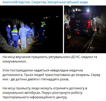 На місці влучення ракети у Запоріжжі працюють рятувальники, медики та комунальники. Усім постраждалим надали медичну допомогу. Трьох людей госпіталізували. Серед них дві дитини 9 та 15 років.