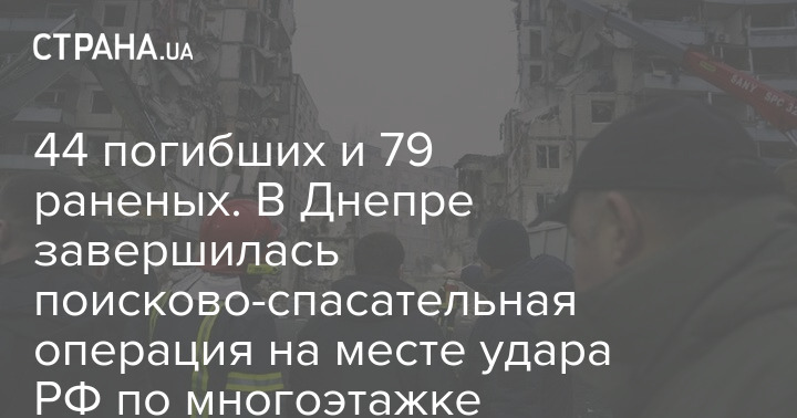 44 загиблих та 79 поранених. У Дніпрі завершилася пошуково-рятувальна операція на місці удару РФ по багатоповерхівці