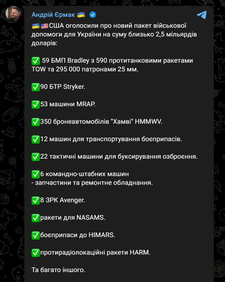 09.30 Глава Офісу президента Єрмак опублікував детальніший список того, що увійшло до нового пакету допомоги США:
