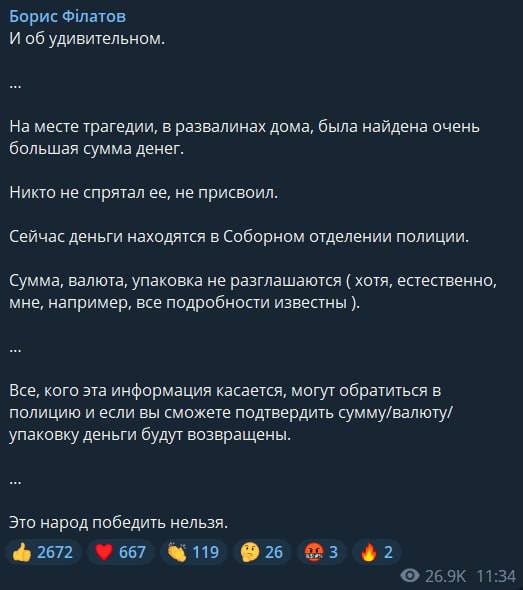 12.35 Мер Дніпра Борис Філатов заявив, що на місці багатоповерхівки, що обрушилася в Дніпрі, "знайдено дуже велику суму грошей".