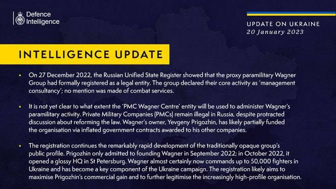 12.40 В Україні воюють до 50 тисяч "вагнерівців", що робить роль куратора ПВК Пригожина важливою у війні в Україні, повідомляє розвідка Британії.