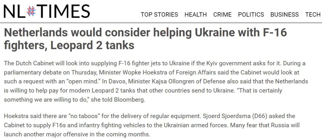 Він також уточнив, що Нідерланди відправляють тільки ті товари, які запитує Україна, тобто для передачі літаків потрібен запит Києва на цю техніку.