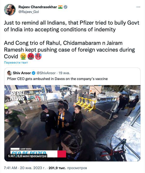 Таким чином Чандрасекар прокоментував відео з керівником Pfizer, який відмовлявся відповідати на запитання журналістів у Давосі щодо вакцини. "Коли ви дізналися, що вакцини не зупиняють передачу інфекції? Як довго ви знали про це, перш ніж заявити про це публічно?" - три хвилини намагається з'ясувати журналіст у Альберта Бурле, проте той не відповідає.