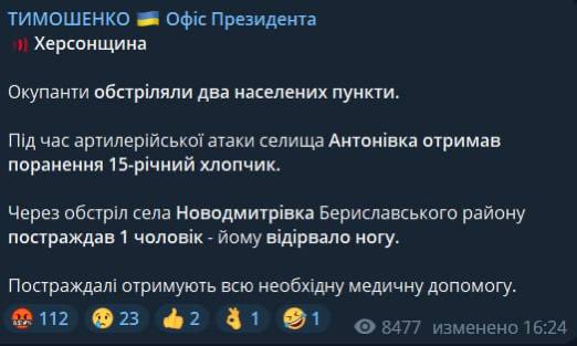 У селі Нова Дмитрівка Херсонської області чоловікові відірвало ногу, а у селищі Антонівка поранено 15-річного підлітка.