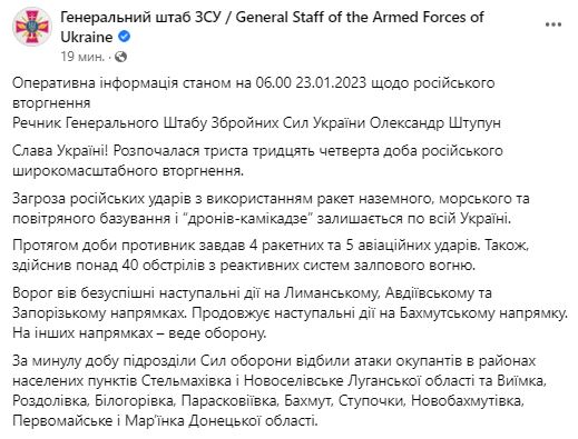 06.50 Генштаб ЗСУ оприлюднив зведення про ситуацію на фронті 23 січня.