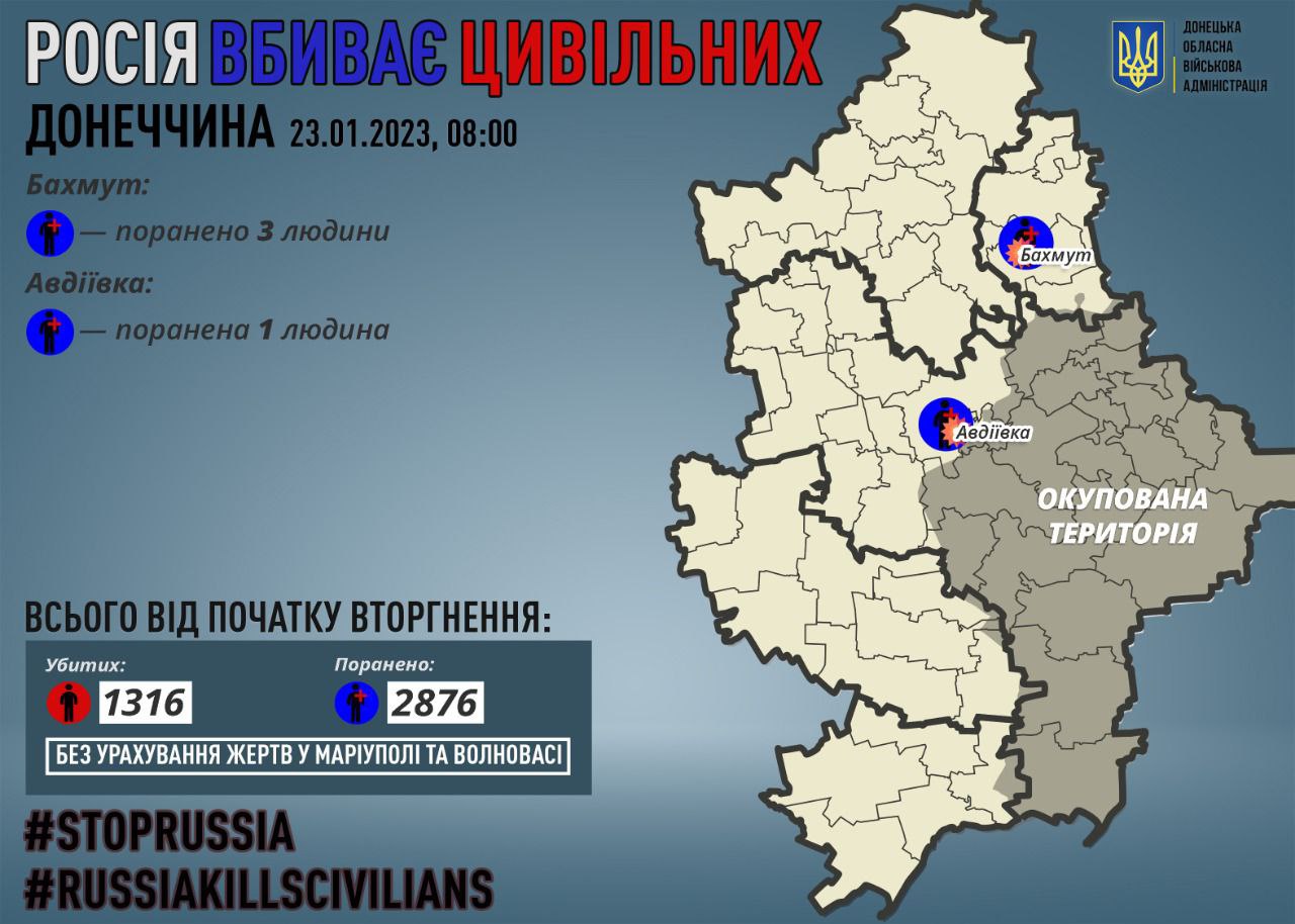 "За 22 січня росіяни поранили 4 мешканців Донбасу: 3 у Бахмуті та 1 в Авдіївці. Наразі неможливо встановити точну кількість жертв у Маріуполі та Волновасі", - написав Кириленко в телеграм-каналі в понеділок вранці.