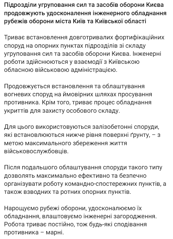 Підрозділи угруповання сил та засобів оборони Києва продовжують обладнати фортифікаційні споруди навколо Києва та Київської області.