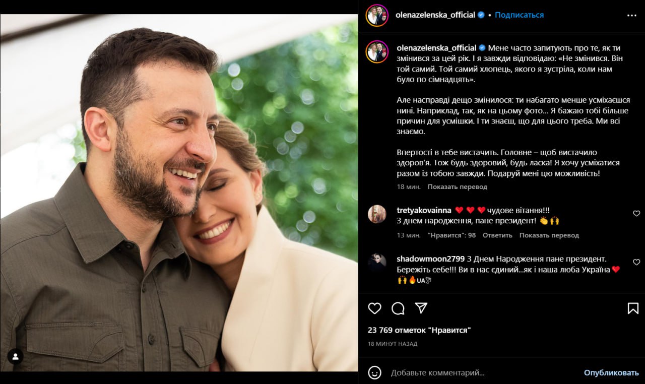 "Мене часто питають, як ти змінився за цей рік. І я завжди відповідаю: "Не змінився. Він той самий. Той самий хлопець, якого я зустріла, коли нам було сімнадцять. Але насправді щось змінилося: ти набагато менше посміхаєшся. Наприклад, як на цьому фото… Я бажаю тобі більше причин для посмішки. І ти знаєш, що для цього потрібне. Ми всі знаємо", - підписала фото із чоловіком у Instagram Олена Зеленська.