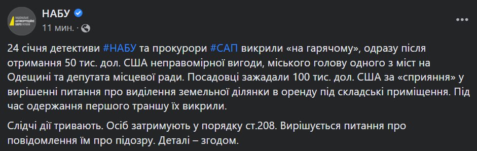 10.45 НАБУ та САП затримали "на гарячому" на хабарі у 50 тисяч доларів мера одного з міст на Одещині та депутата місцевої ради.