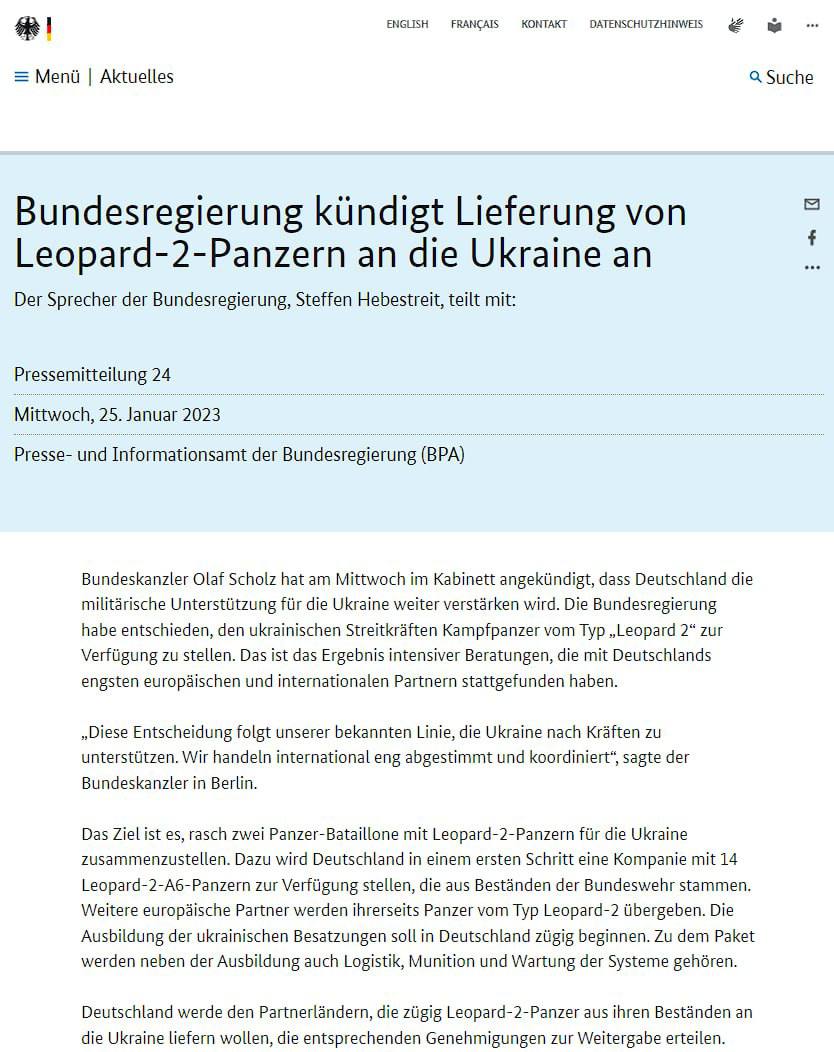 Тим часом російське посольство в Берліні вже заявило, що рішення Німеччини відправити Україні танки Leopard «перекладає конфлікт на новий рівень протистояння».
