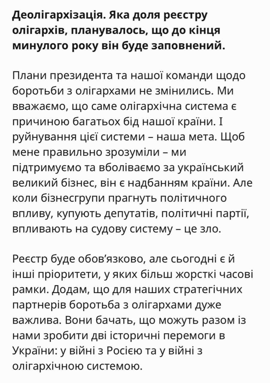 «Щоб мене правильно зрозуміли – ми підтримуємо та вболіваємо за український великий бізнес, він надбання країни. Але коли бізнес-групи прагнуть політичного впливу, купують депутатів, політичні партії, впливають на судову систему – це зло. Реєстр буде обов'язковий, але сьогодні є й інші пріоритети, які мають більш жорсткі часові межі», – заявив Єрмак.