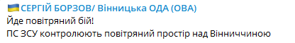 За словами голови Вінницької ОВА Сергія Борзова, "йде повітряний бій, ПС ЗСУ контролюють повітряний простір над Вінницькою областю".