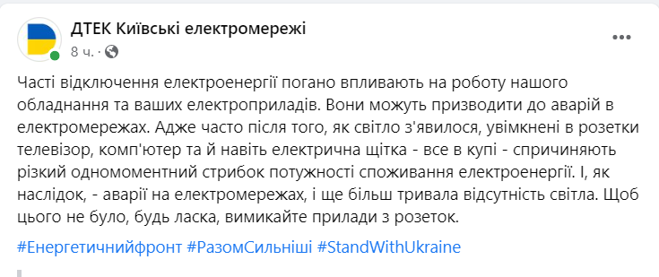 "Часті відключення електрики впливають на продуктивність нашого обладнання та ваших електроприладів. Вони можуть призвести до аварій в електромережах. Часто після появи світла в розетках включаються телевізор, комп'ютер і навіть електрична щітка - всі разом - викликають різкий одномоментний стрибок споживання енергії", - йдеться в повідомленні.