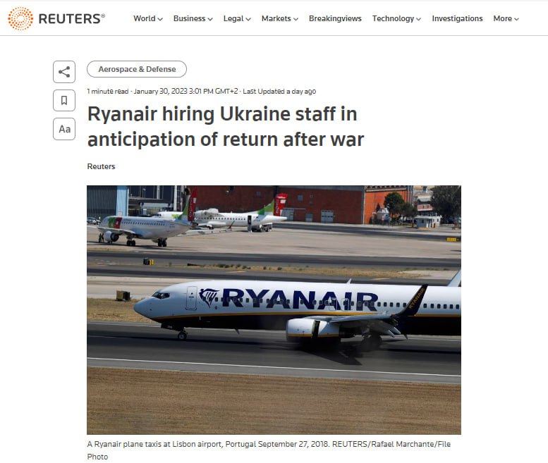 13:20 Авіакомпанія Ryanair набирає співробітників в Україні в очікуванні повернення після війни, повідомляє Reuters.
