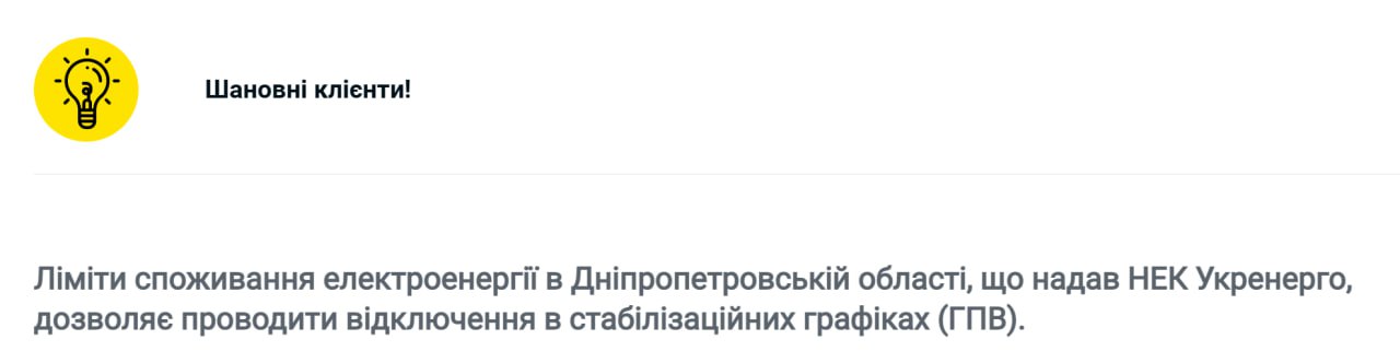 У Києві та Дніпропетровській області ліміти споживання від "Укренерго" дають змогу застосувати стабілізаційні відключення світла за графіками, повідомляє ДТЕК.