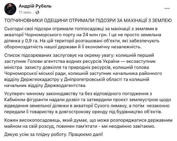 15.12 Сьогодні підозри отримали низка колишніх та нинішніх чиновників за махінації із землями в акваторії Чорноморського порту на 24 млн грн. Про це на своїй сторінці у ФБ повідомив начальник Департаменту стратегічних розслідувань Нацполіції Андрій Рубель.