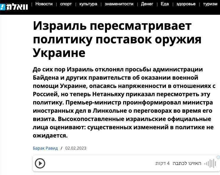 Досі Ізраїль відхиляв прохання Заходу та Києва надати військову допомогу Україні, проте видання пише, що прем'єр-міністр Нетаньяху доручив своєму уряду переглянути цю позицію.