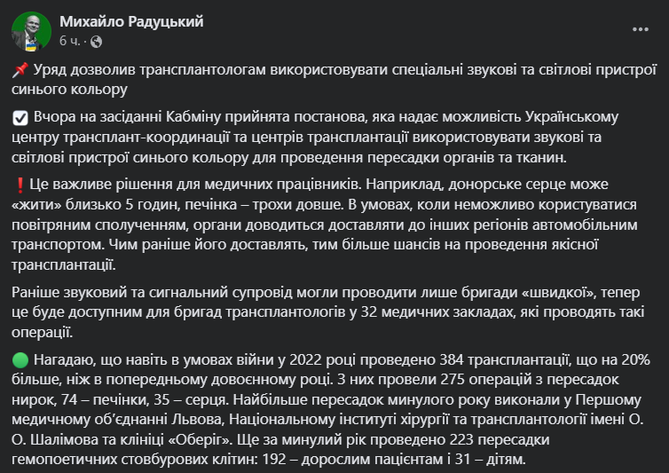"Раніше звуковий та сигнальний супровід могли проводити лише бригади "швидкої", тепер це буде доступно бригадам трансплантологів у 32 медичних закладах, які проводять такі операції", - пояснив голова комітету.