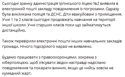 В понеділок, 6 лютого, адміністрація Ірпінського ліцею №2 виявила на електронній пошті закладу повідомлення із погрозами.