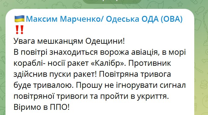 Противник запустив ракети Україною, повідомив одеський губернатор Максим Марченко.