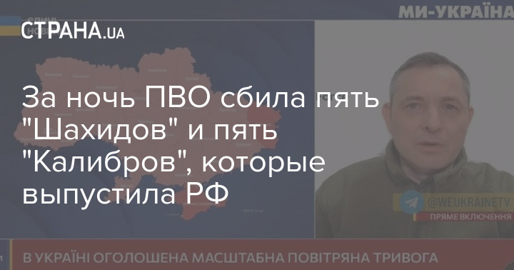Також знищено п'ять із шести "Калібрів", які атакували Україну цієї ночі, додав Ігнат.
