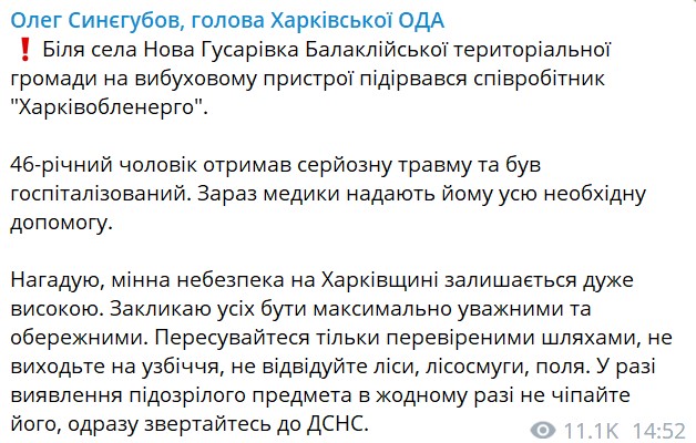 Поряд із селом Нова Гусарівка Харківської області на вибуховому пристрої підірвався співробітник "Харківобленерго".