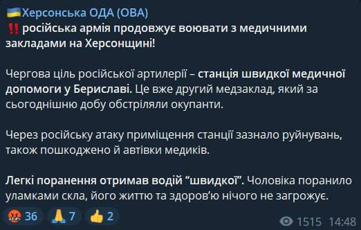 В Бериславі Херсонської області обстріляно станцію швидкої допомоги. Це вже друга медустанова, яку за сьогодні обстріляв супротивник.