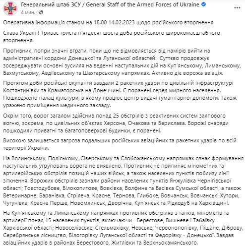 В Генеральному штабі Збройних сил України опублікували оперативне зведення з фронту станом на 18.00 14 лютого.
