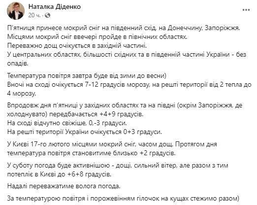 Синоптик Наталія Діденко повідомляє, що п'ятниця принесе мокрий сніг на південний схід, Донбас, Запоріжжя. Подекуди мокрий сніг пройде і в північних областях. Переважно дощ очікується у західній частині. У центральних областях, більшості східних та південної частини України – без опадів.