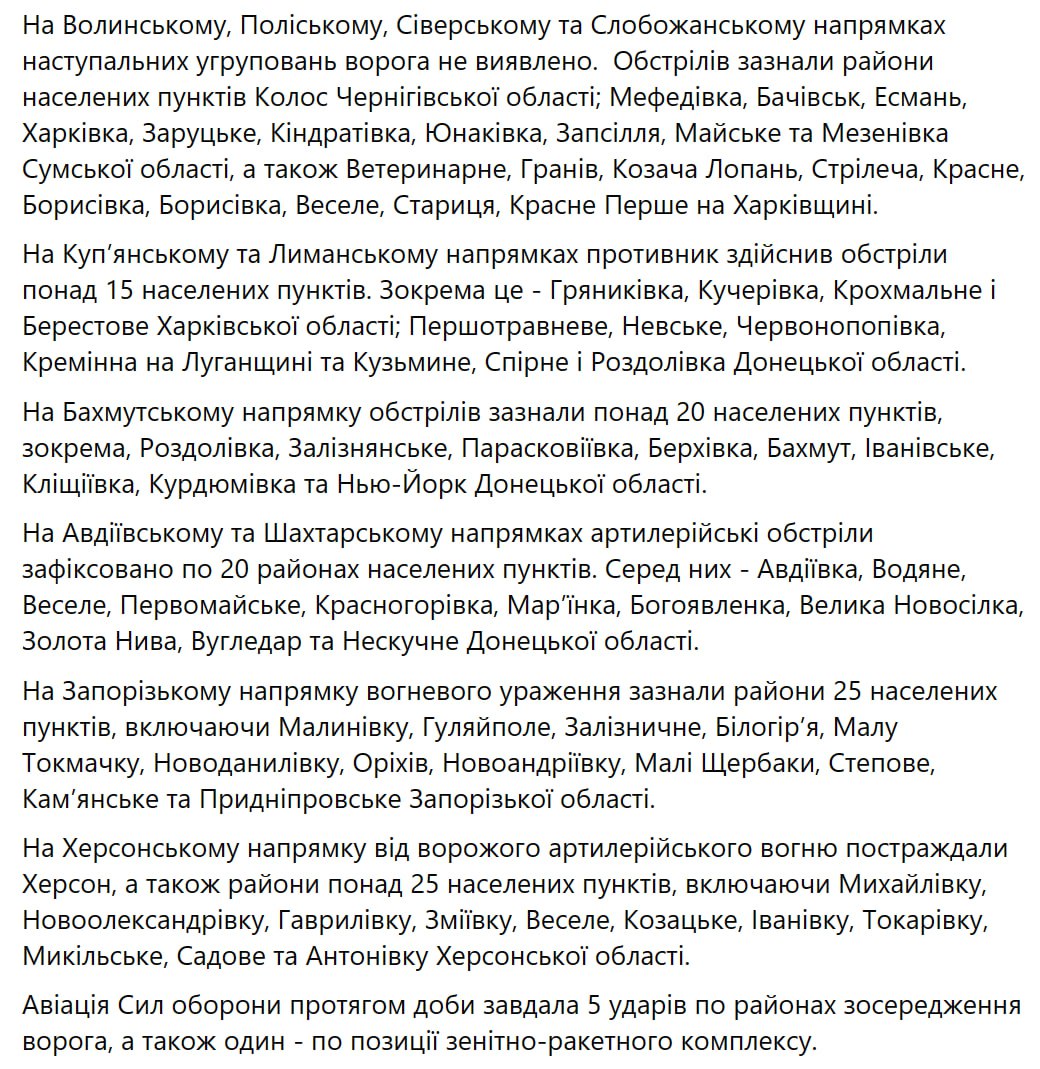 1. Протягом доби противник завдав 10 ракетних та 29 авіаційних ударів (Україна завдала п'яти авіаударів). Загроза подальших ракетних ударів залишається дуже високою на всій території України.