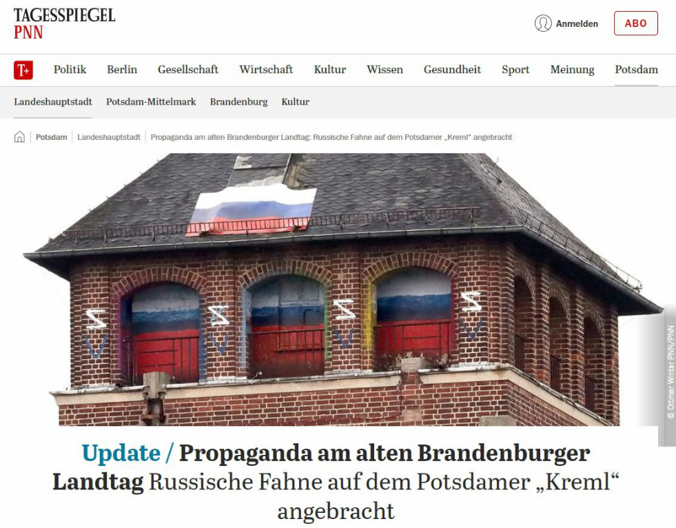 16:47 У німецькому Потсдамі невідомі встановили російський прапор на вежі, де раніше засідав ландтаг (земельний парламент) Бранденбурга. Про це повідомляє агентство Tagesspiegel.