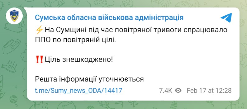 На Сумщині вдень у п'ятницю, 17 лютого, була повітряна тривога. Протиповітряна оборона (ППО) України спрацювала за метою.