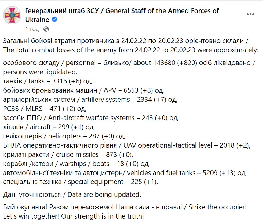 Генштаб Збройних сил України оприлюднив нове зведення про загальні бойові втрати російської армії за час повномасштабної війни в Україні - з 24 лютого 2022 року по 20 лютого 2023 року.
