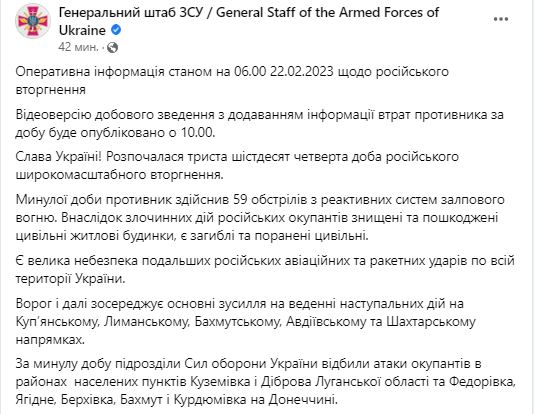 В середу, 22 лютого, Генштаб ЗСУ оприлюднив зведення про ситуацію на фронті минулої доби.