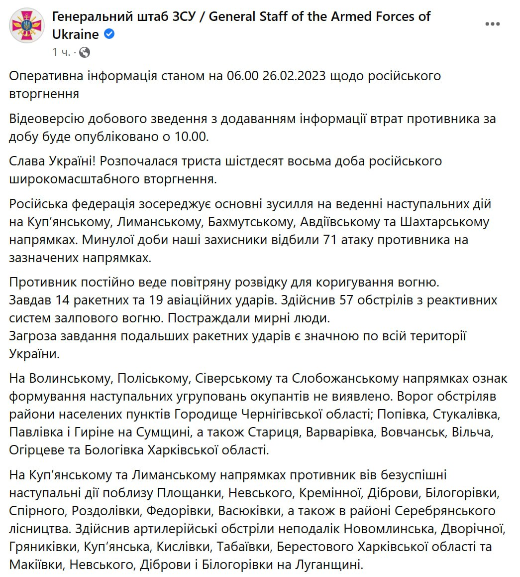 Війна в Україні триває вже 368-й день. Ми слідкуємо за новинами 26 лютого у своєму онлайні.
