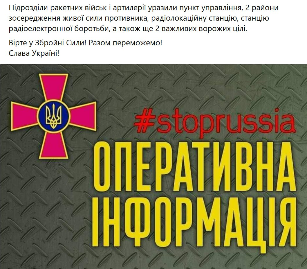 - За добу відбито понад 70 атак супротивника. На Куп'янському та Лиманському напрямках противник вів безуспішні наступальні дії поблизу Площанки, Невського, Кремінної, Діброви, Білогорівки, Спірного, Роздолівки, Федорівки, Васюківки, а також в районі Серебрянського лісництва. Здійснив артилерійські обстріли неподалік Новомлинська, Дворічної, Гряниківки, Куп’янська, Кислівки, Табаївки, Берестового Харківської області та Макіївки, Невського, Діброви і Білогорівки на Луганщині.