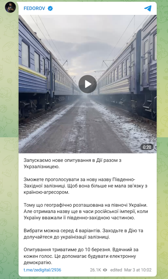 Українцям пропонують обрати нову назву для південно-західної залізниці, що географічно розташована на півночі України. Відповідне опитування з'явилося у "Дії".